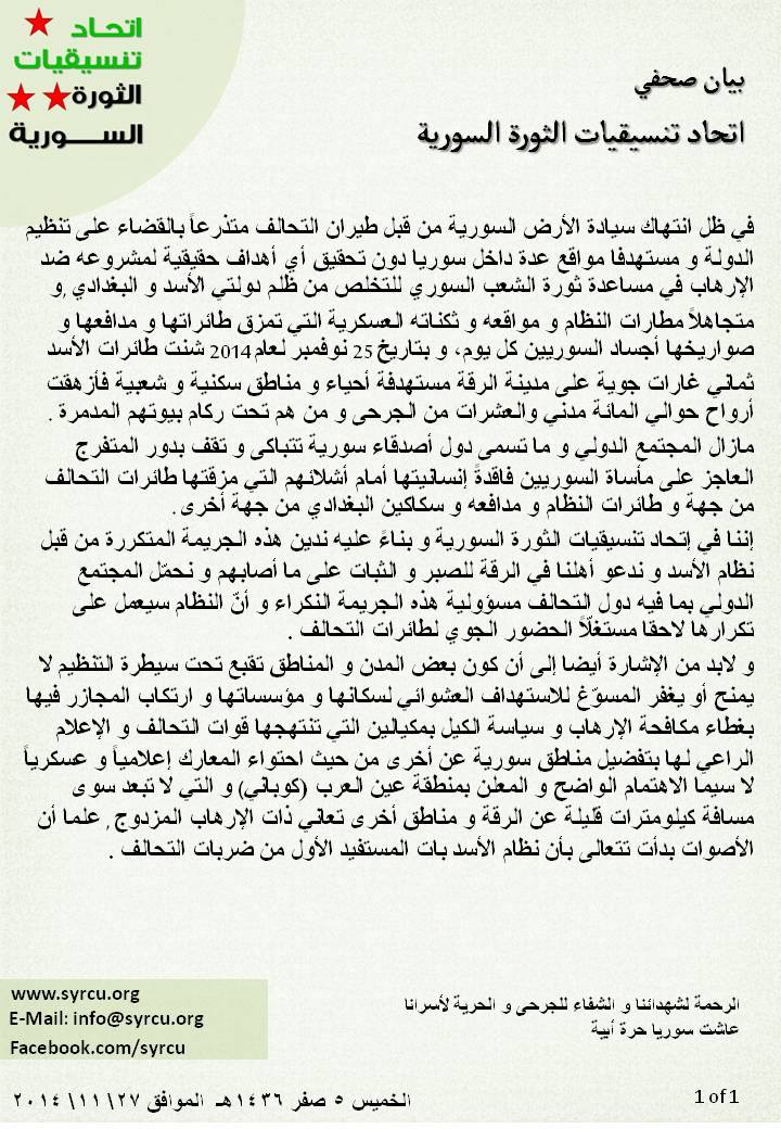 إننا في إتحاد تنسيقيات الثورة السورية و بناءً عليه ندين هذه الجريمة المتكررة من قبل نظام الأسد و ندعو أهلنا في الرقة للصبر و الثبات على ما أصابهم و نحمّل المجتمع الدولي بما فيه دول التحالف مسؤولية هذه الجريمة النكراء و أنّ النظام سيعمل على تكرارها لاحقا مستغلّاً الحضور الجوي لطائرات التحالف .