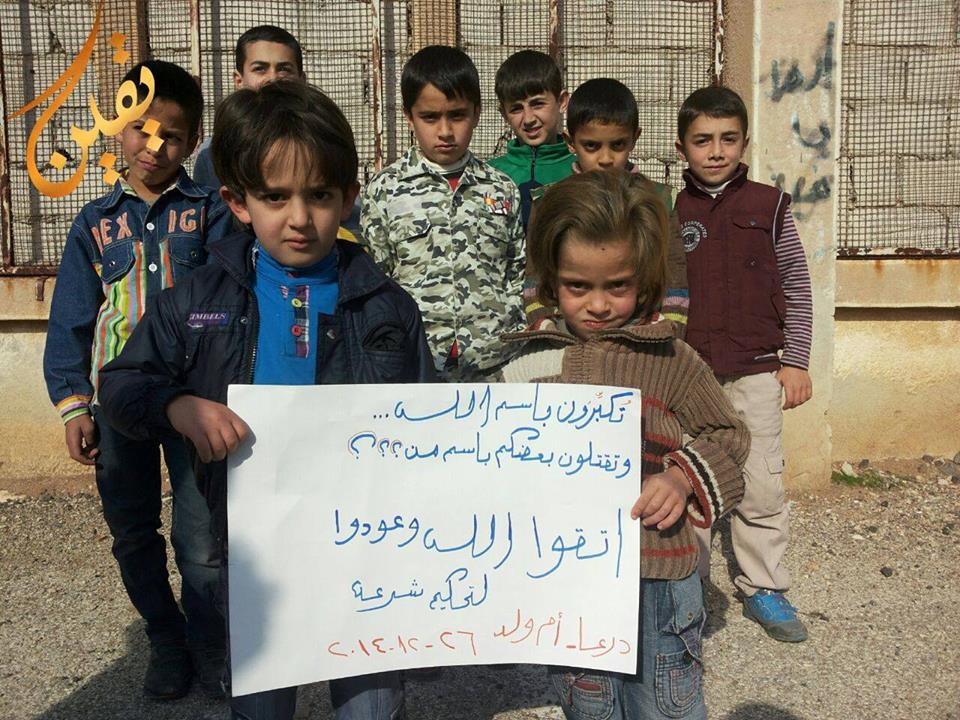 وقام الناشطون ضمن فعاليات الحملة برفع لافتات في المناطق المحررة بدرعا تدعو المقاتلين لأن يوجهو السلاح الى الجبهات وليس الى صدور بعضهم البعض .