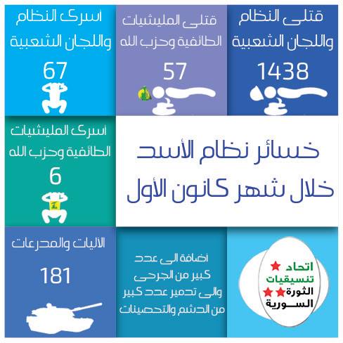 أحصى اتحاد تنسيقيات الثورة خسائر نظام الأسد خلال شهر كانون الأول الماضي , حيث بلغ عدد قتلى النظام واللجان الشعبية 1438 قتيل , في حين قتل 57  عنصراً من  المليشيات الطائفية التابعة له , كما تمكن الثوار في الشهر الماضي من أسر سبعة وستين عنصراً لقوات النظام وستة عناصر لمليشيا حزب الله اللبناني .