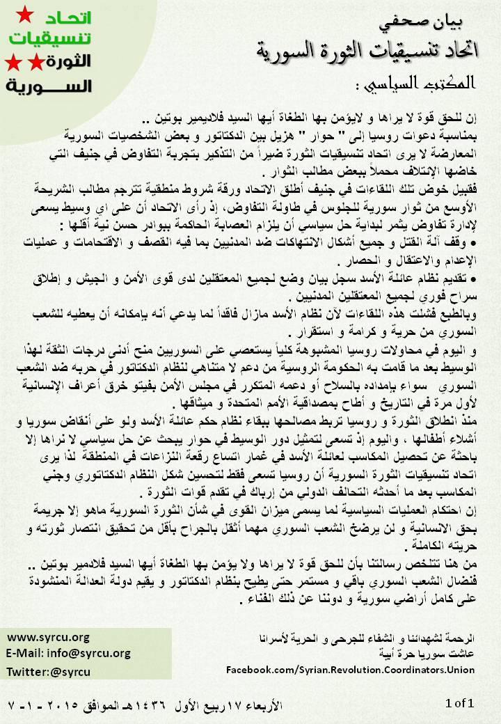 لذا يرى اتحاد تنسيقيات الثورة السورية أن روسيا تسعى فقط لتحسين شكل النظام الدكتاتوري وجني المكاسب بعد ما أحدثه التحالف الدولي من إرباك في تقدم قوات الثورة .