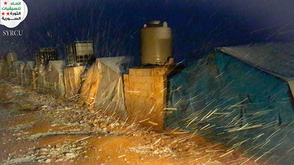 أفاد عضو اتحاد تنسيقيات الثورة حمزة الرنكوسي باستشهاد خمس أشخاص جلهم من الأطفال في مخيمات السوريين بعد مرور يومين على العاصفة الثلجية التي تضرب المنطقة ، حيث لا يملك اللاجئون هناك مأوى سوى الخيام التي لا تقيهم حر الصيف أو برد الشتاء الذي تسبب بمقتل عدد منهم، وأشار حمزة إلى إن ارتفاع الثلج وصل في المخيمات إلى متر تقريبا والذي تسبب بهبوط الخيام على قاطنيها او حبسهم داخلها، وهو ما تسبب بمقتل خمسة لاجئين على الأقل فيما يرشح العدد للازدياد اذا ما تم انقاذ اللاجئين هناك .