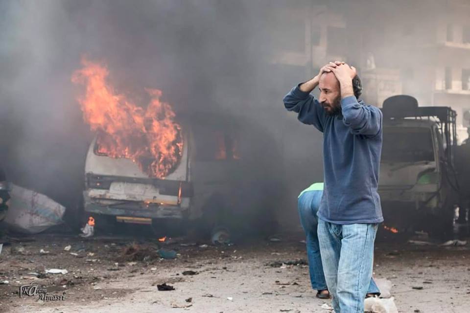15- مجزرة في جسر الحج بريف حلب راح ضحيتها 47 شهيداً نتيجة قصف بالبراميل المتفجرة على محطة انطلاق الحافلات 12- 5- 2015
