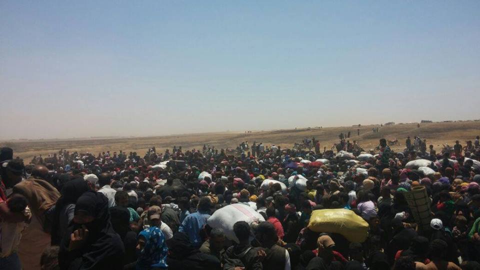 ( الصورة لألاف النازحين من تل أبيض على الحدود السورية التركية )