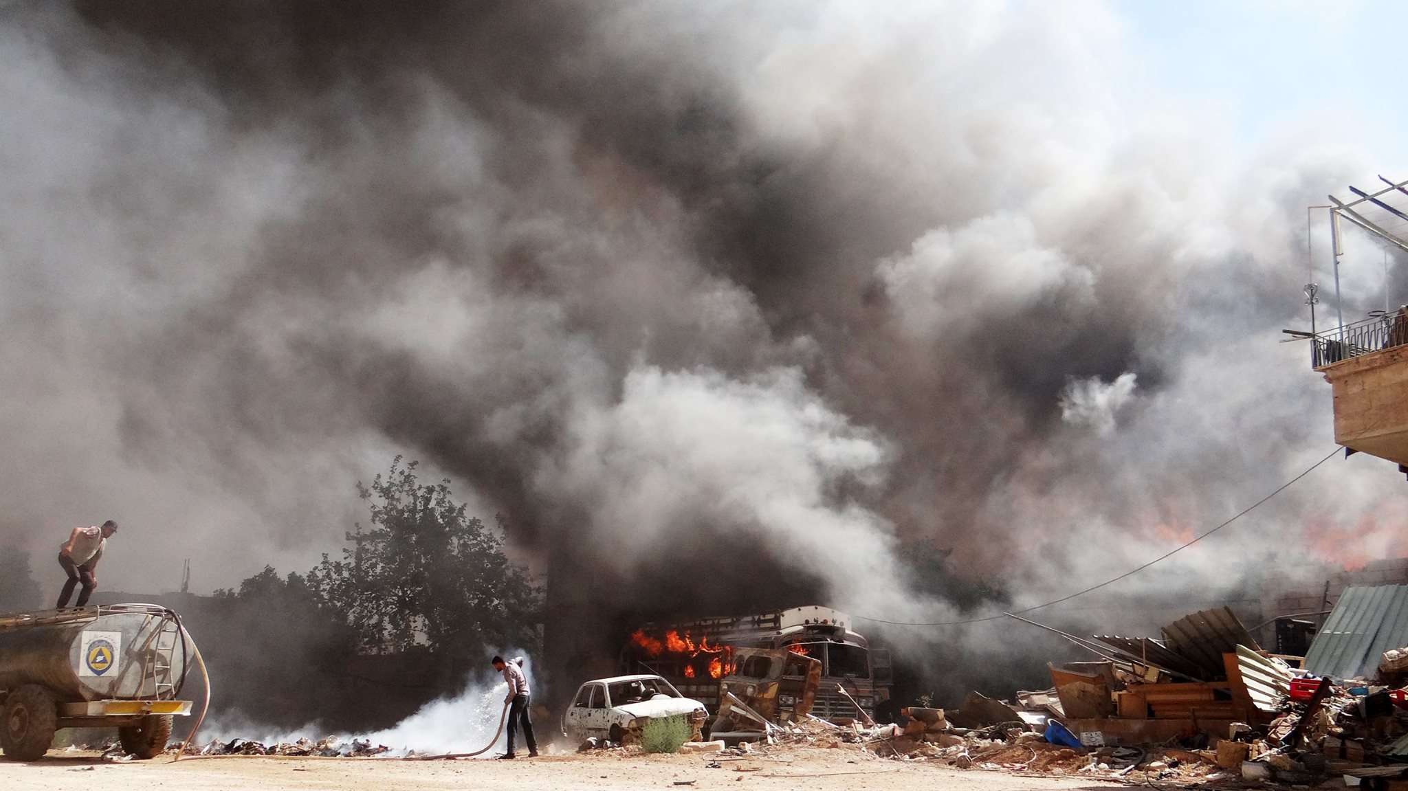 كما استهدفت قوات النظام اليوم مدينة داريا في ريف دمشق الغربي , بغارتين جويتين بثلاثين اسطوانة متفجرة من الطيران الحربي محملة بمادة النابالم الحارق المحرمة دولياً , استهدفت الغارة الأولى منطقة ترابية ب 15 اسطوانة متفجرة , فيما استهدفت الغارة الثانية الأحياء السكنية وسط مدينة داريا ب 15 اسطوانة متفجرة , مما أدى لاشتعال حرائق في أكثر من 15 منزلاً في المنطقة , اضافة لاصابة 7 مدنيين باصابات متوسطة .