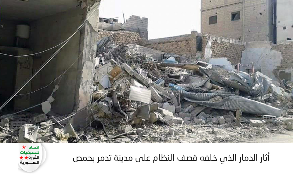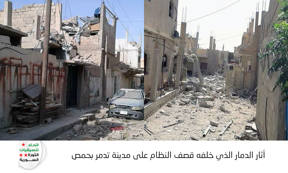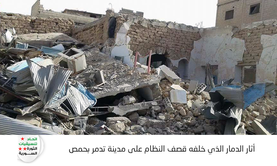 يقوم النظام عبر مقاتلاته الحربية استهداف مدينة تدمر بغارات جوية عنيفة , أسفرت عن تدمير المدينة بشكل شبه كامل.