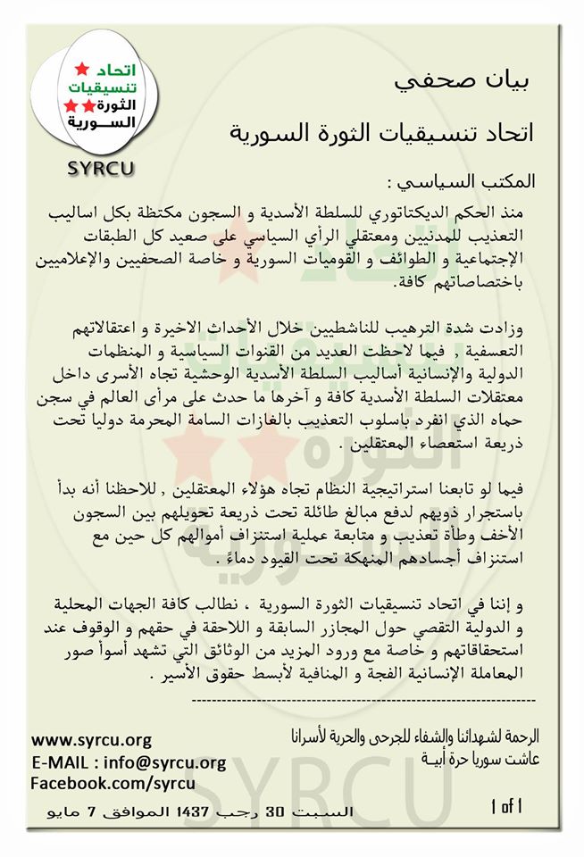 و إننا في اتحاد تنسيقيات الثورة السورية ، نطالب كافة الجهات المحلية و الدولية التقصي حول المجازر السابقة و اللاحقة في حقهم و الوقوف عند استحقاقاتهم و خاصة مع ورود المزيد من الوثائق التي تشهد أسوأ صور المعاملة الإنسانية الفجة و المنافية لأبسط حقوق الأسير .