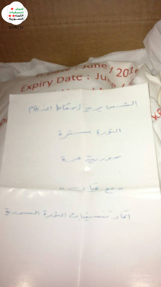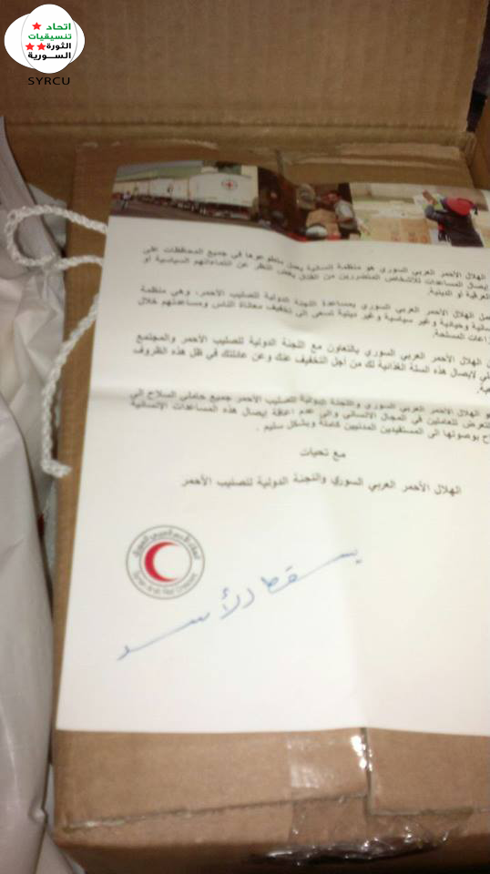 و تلقى مؤيدوا الأسد صدمة كبيرة عند استلامهم المساعدات الإنسانية المقدمة من قبل الصليب الأحمر والهلال الأحمر , حيث  استطاع "محمد الأسعد" عضو اتحاد تنسيقيات الثورة السورية من إختراق مكتب اللجنة الدولية للصليب الأحمر و الهلال الأحمر العربي السوري , المسؤول عن إدخال المساعدات الإنسانية لمناطق تقع تحت سيطرة النظام و حواجزه العسكرية , بوضع منشورات تحمل شعارات الثورة السورية المطالبة بإسقاط النظام و رأسه "بشار الأسد" .