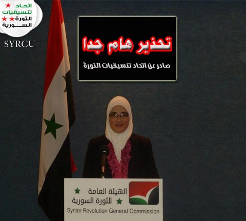 اننا في اتحاد تنسيقيات الثورة السورية نوجه تحذير أخير للمدعوة آلاء البساتنة من التمادي في التسلق على دماء الشهداء و المتاجرة بجراح الشعب السوري المكلوم و نؤكد أن لجوءها الى التدليس و الكذب باسم الثورة السورية بدءا من انتحالها لصفة ممثل للهيئة العامة للثورة في أمريكا وصولا الى انتحالها مؤخرا صفة عضو اتحاد تنسيقيات الثورة السورية سيترتب عليه المحاسبة أمام الشعب السوري ، فقد أصبح اجرام تجار الدم الخنجر المسموم في خاصرة الثورة السورية .