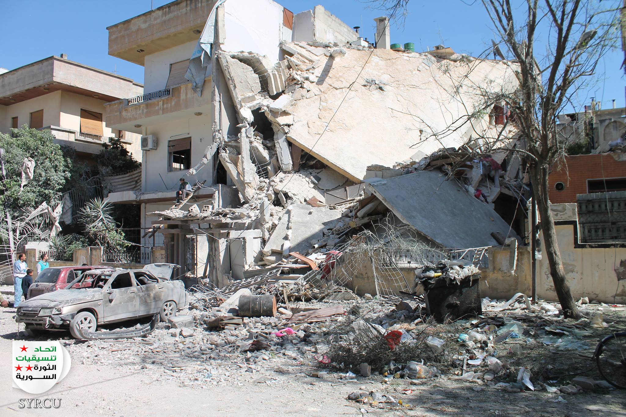 الجيش الحر يستهدف مبنى في حي تشرين الدمشقي يتمركز به قناص تابع لقوات النظام بمدفع 82 وتحقيق اصابة مباشرة