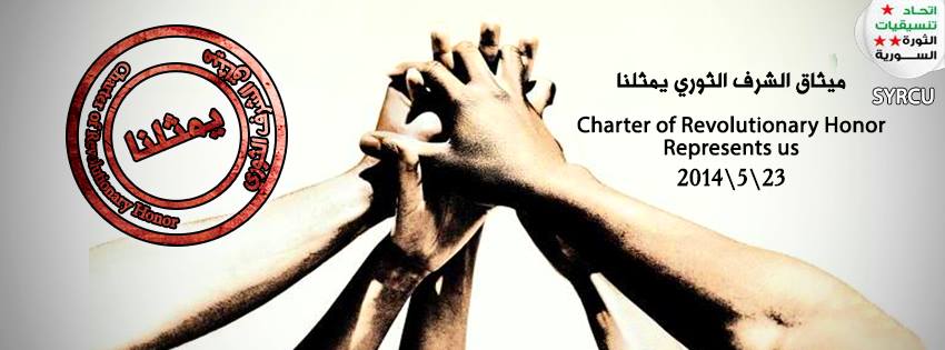 - إطلاق ميثاق شرف ثوري للكتائب المقاتلة يتضمن أهم المبادئ التي تحكم العمل الثوري, وبينها رفض الغلو والتكفير واحترام حقوق الإنسان ورفض تقسيم سوريا والاعتماد على العناصر السورية في القتال ضد النظام.