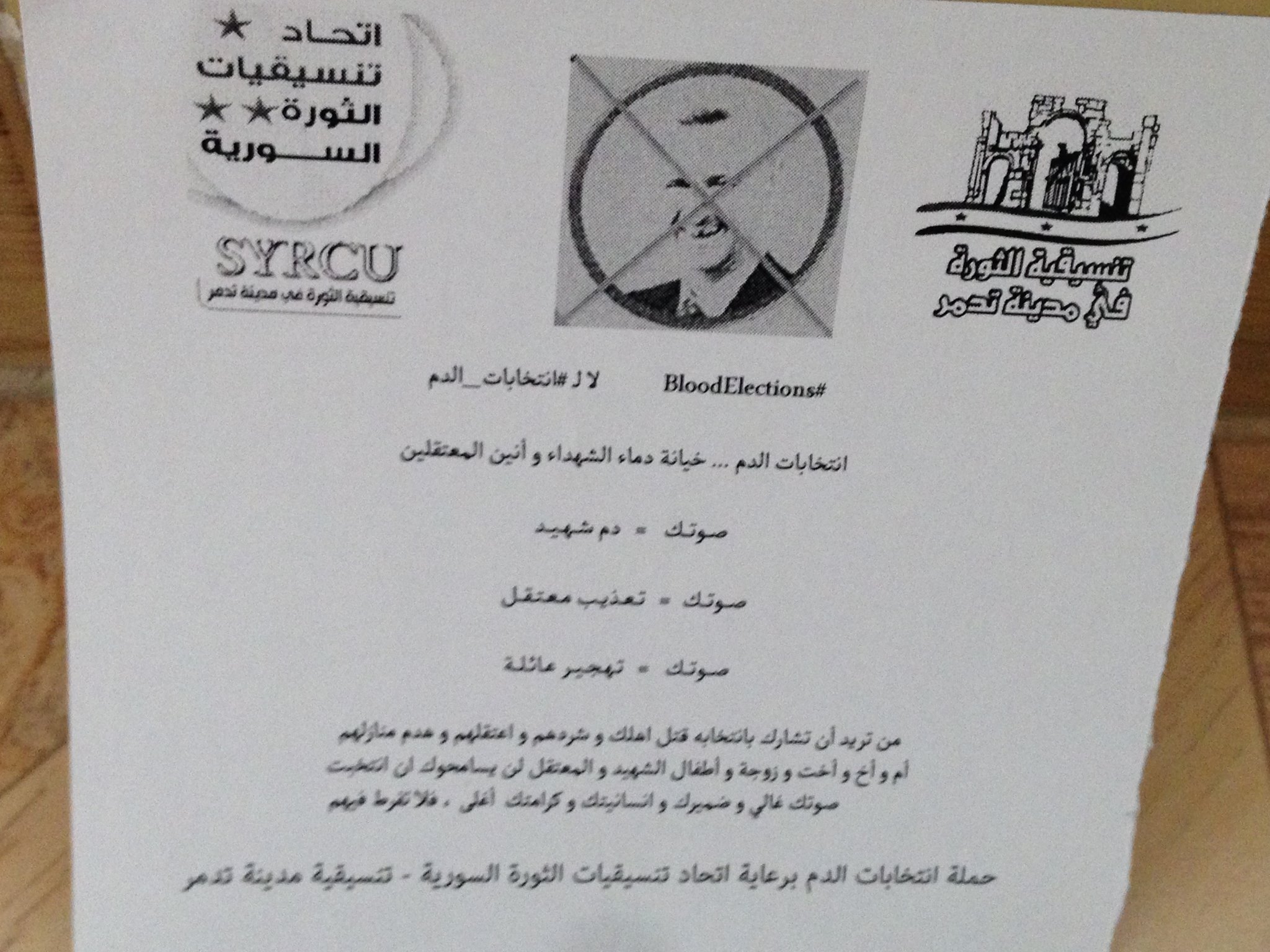 ضمن حملة ‫انتخابات الدم‬ و التي يشارك فيها اتحاد تنسيقيات الثورة السورية ,  قام اعضاء من اتحاد التنسيقيات بتوزيع منشورات تنديد بتلك الانتخابات و توعية لأهالي مدينة تدمر لعدم المشاركة بالانتخابات التي تجري على دماء الشهداء و أنين المعتقلين , وتم االتوزيع في كافة احياء مدينة تدمر .