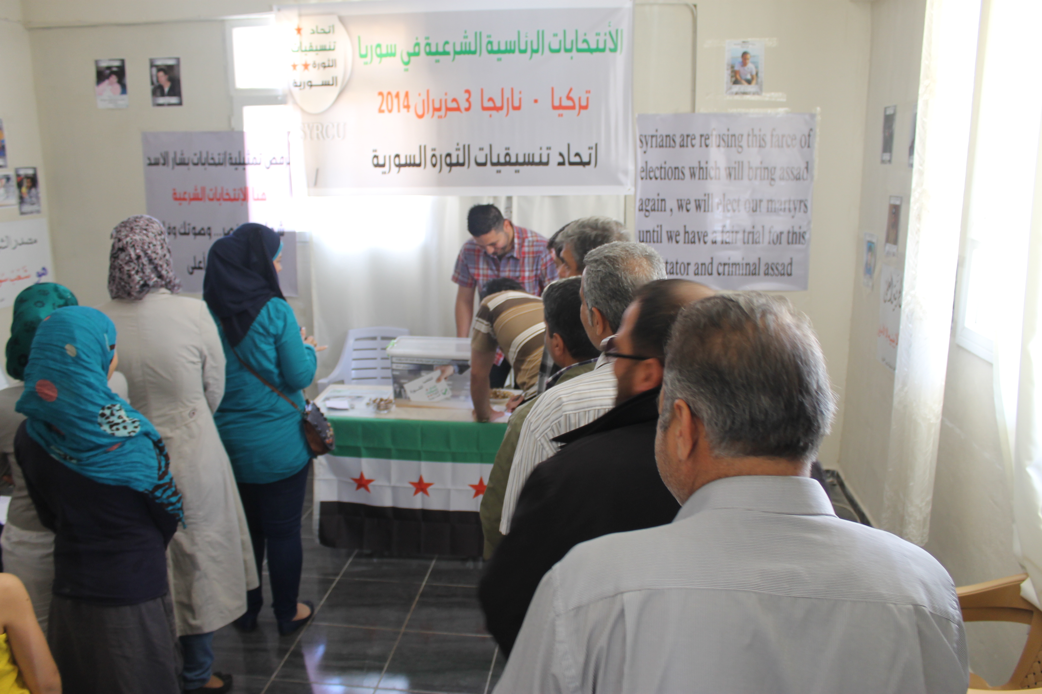 Syrian people who are displaced by Bashar Al-Assad barrels in Northern Syria voting in the polling station whose candidates are the revolution martyrs confirming that they reject Bashar Al-Assad elections and proceed on the path of martyrs until liberation of Syria and trail the dictator Bashar al-Assad .