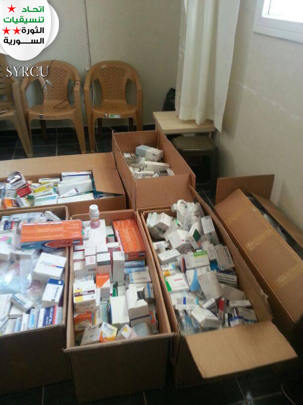 قام المكتب الطبي لاتحاد تنسيقيات الثورة السورية بايصال كمية من الأدوية إلى مستوصف الهدى في مدينة الباب بريف حلب و جمعية نارليجا للإغاثة على الحدود السورية التركية حيث يتم توزيع هذه الأدوية بشكل مجاني على المتضررين في تلك المناطق .