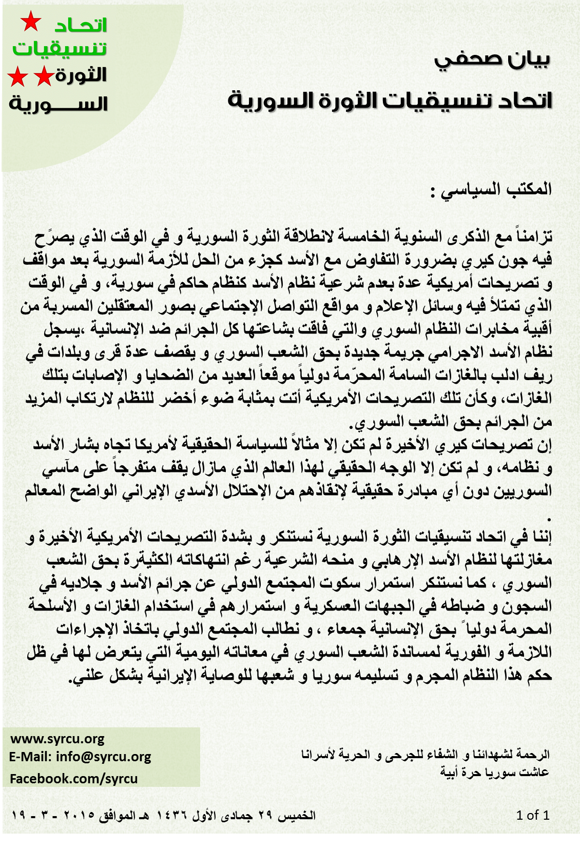 إننا في اتحاد تنسيقيات الثورة السورية نستنكر و بشدة التصريحات الأمريكية الأخيرة و مغازلتها لنظام الأسد الإرهابي و منحه الشرعية رغم انتهاكاته الكثيةرة بحق الشعب السوري , كما نستنكر استمرار سكوت المجتمع الدولي عن جرائم الأسد و جلاديه في السجون و ضباطه في الجبهات العسكرية و استمرارهم في استخدام الغازات و الأسلحة المحرمة دوليا ً بحق الإنسانية جمعاء , و نطالب المجتمع الدولي باتخاذ الإجراءات اللازمة و الفورية لمساندة الشعب السوري في معاناته اليومية التي يتعرض لها في ظل حكم هذا النظام المجرم و تسليمه سوريا و شعبها للوصاية الإيرانية بشكل علني.